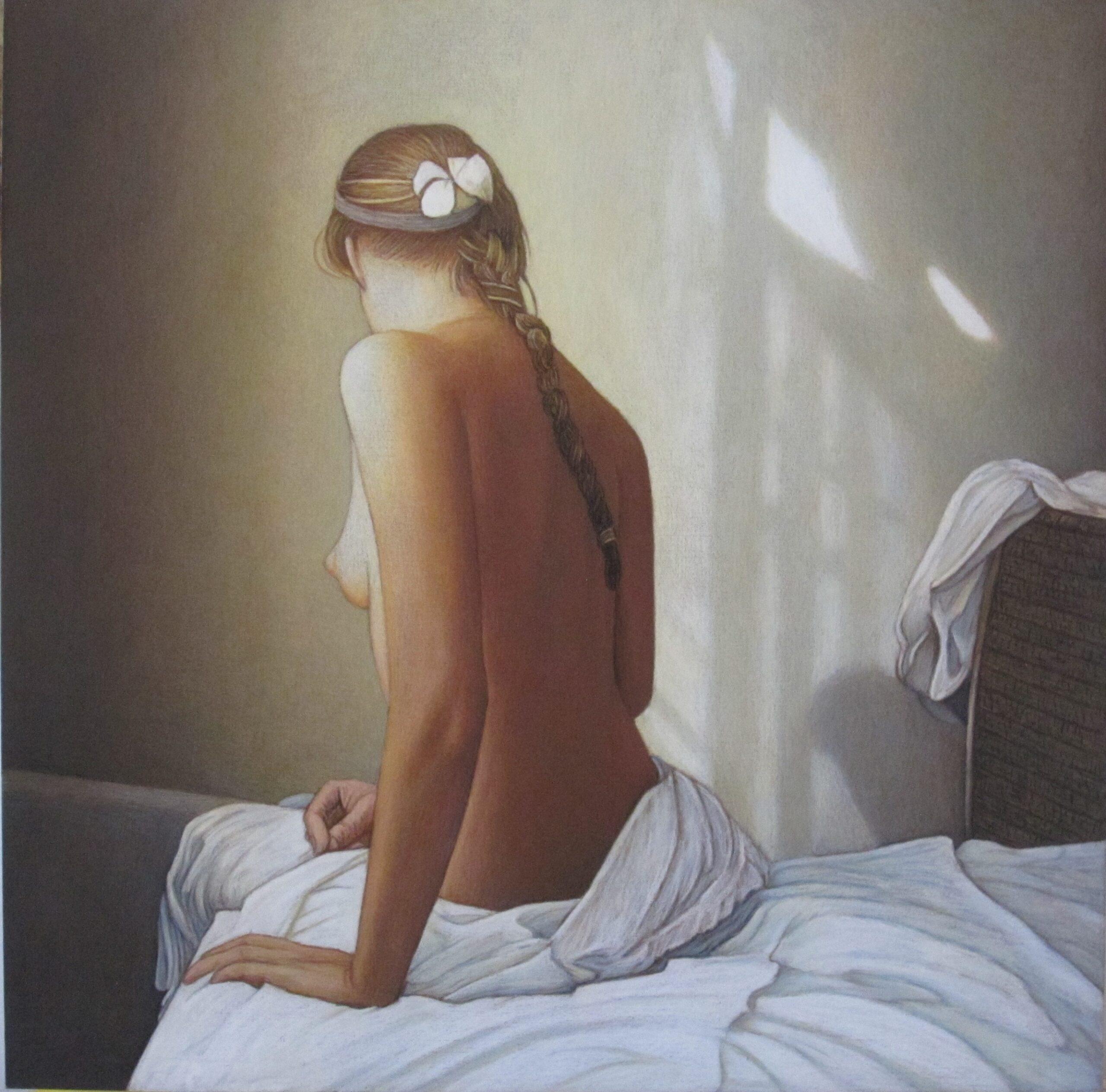 Alexia di spalle (d’après D.Hamilton),(2024), t,m, su MDF, cm 50×50