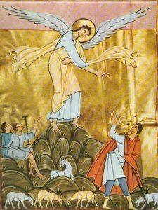 “Annunciazione ai pastori”. Evangelario.Pergamena Monaco. Museo Civico bavarese.Foto da: Il libro d’arte.Origini dell’arte occidentale,Vol.I, G.I. NewYork- Milan, 1969, pag.2019